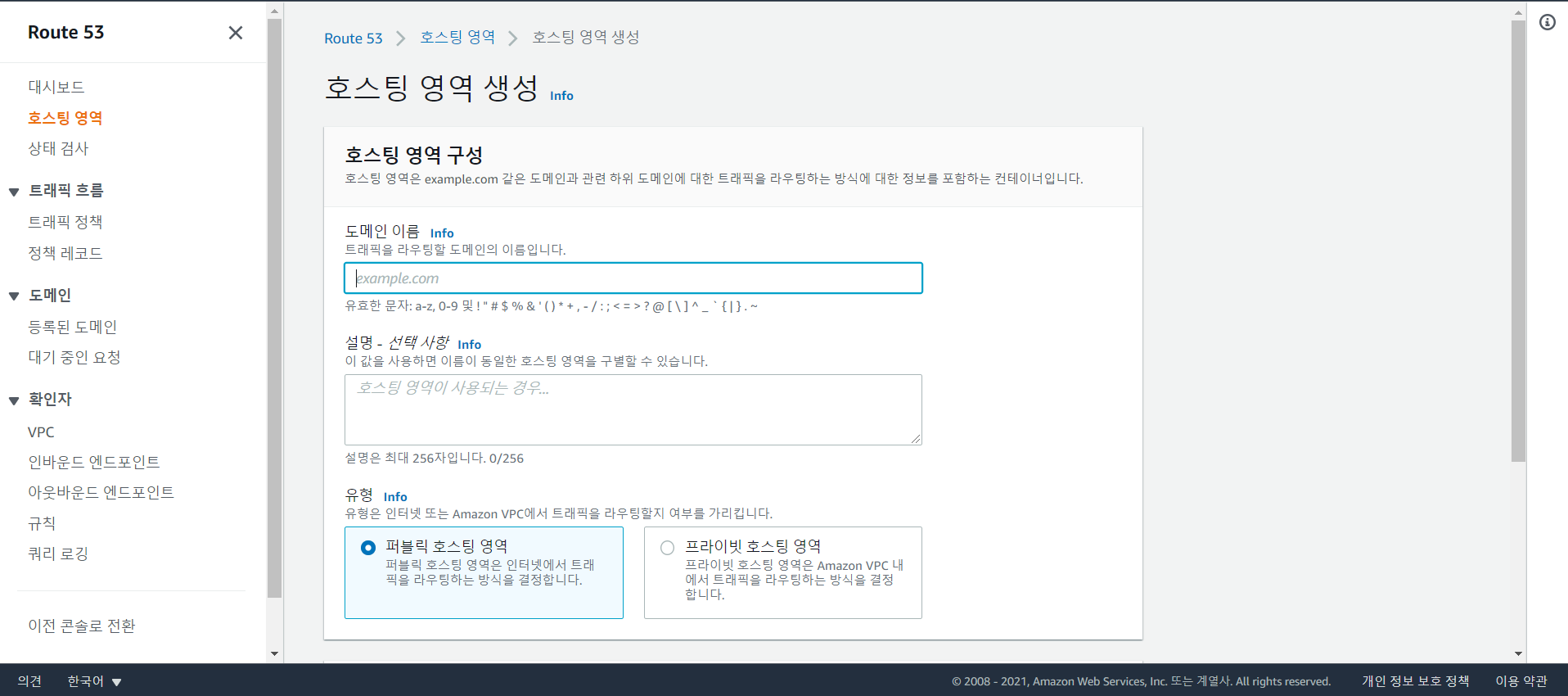 - 도메인 이름 입력 후 [호스팅 영역 생성] 클릭