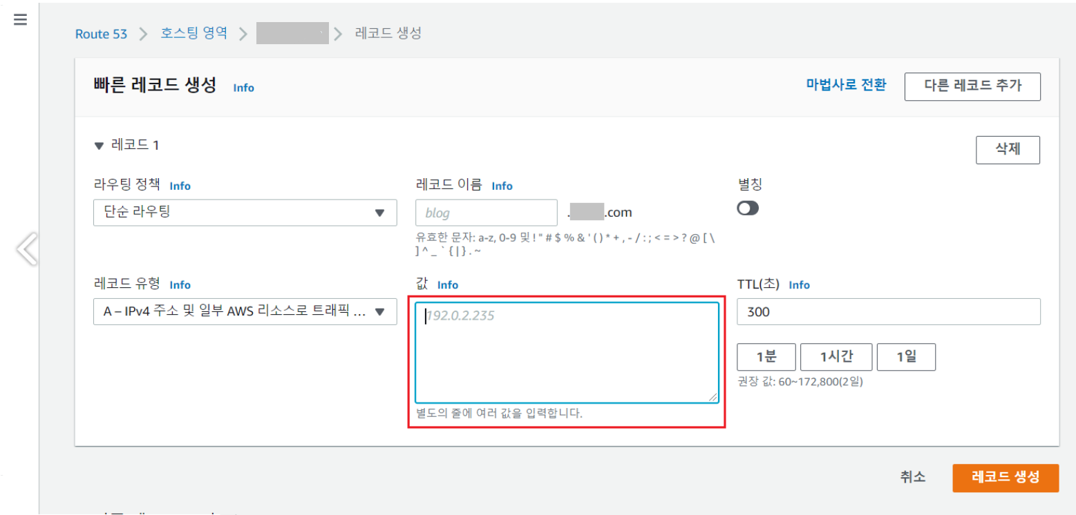 - [레코드 생성] 클릭 후 '값'에 EC2의 탄력적 IP 입력