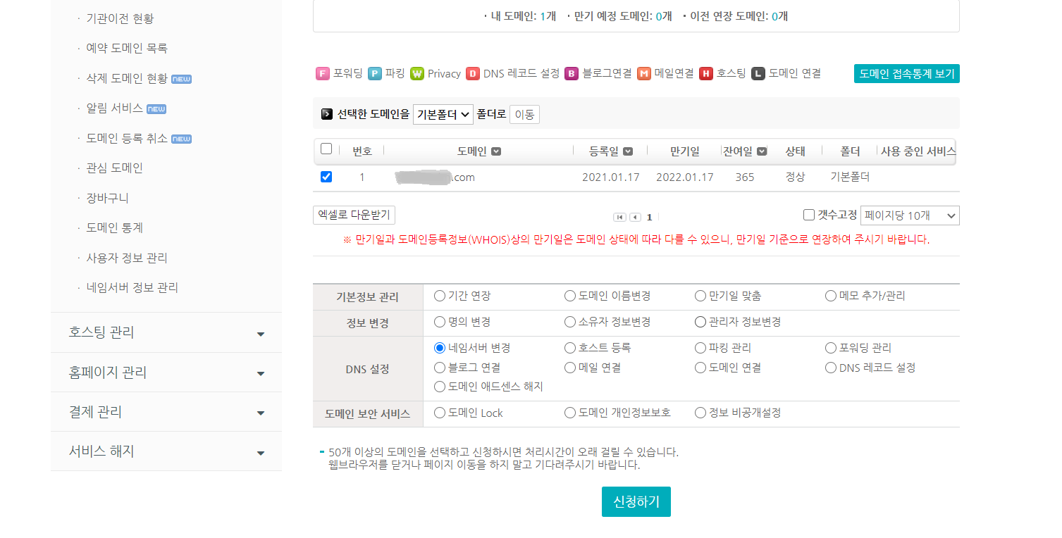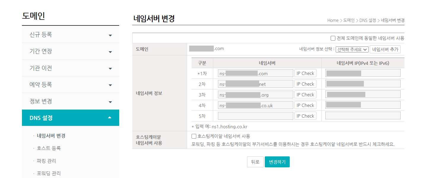 - 도메인 선택 후 'DNS 설정'의 '네임서버 변경' 클릭