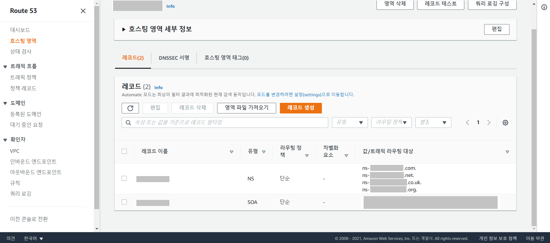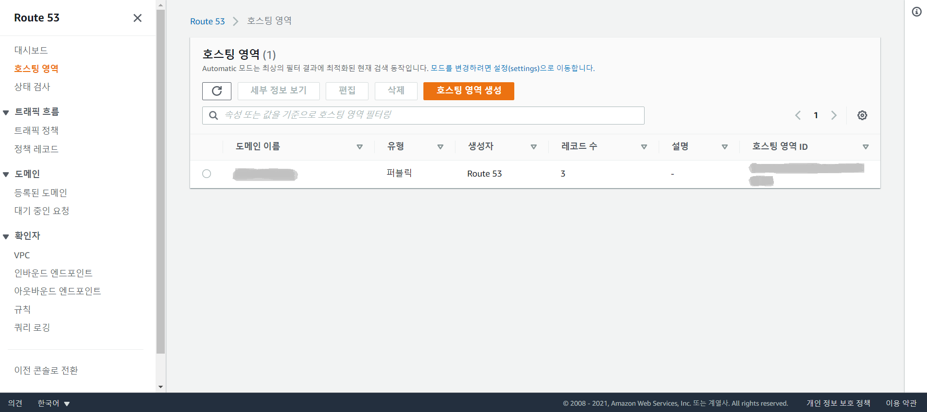 - Route 53의 호스팅 영역에 접속 후 [호스팅 영역 생성] 클릭