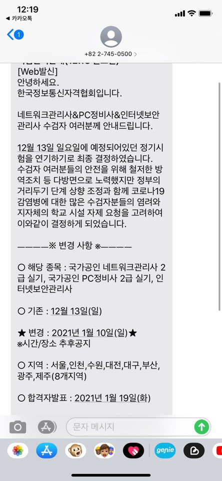 원래는 12월 13일에 시험 보는거였는데 코로나때문에 밀림. 사실 이 때 2.5단계가 되면서 밀릴 거 예상해서 며칠 전부터 공부를 안함..ㅋㅠ 그러고선 대충 한번은 정리해놨다고 생각하고 여유부리다가 시험 일주일 전부터 다시 공부시작했던 것 같다.